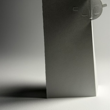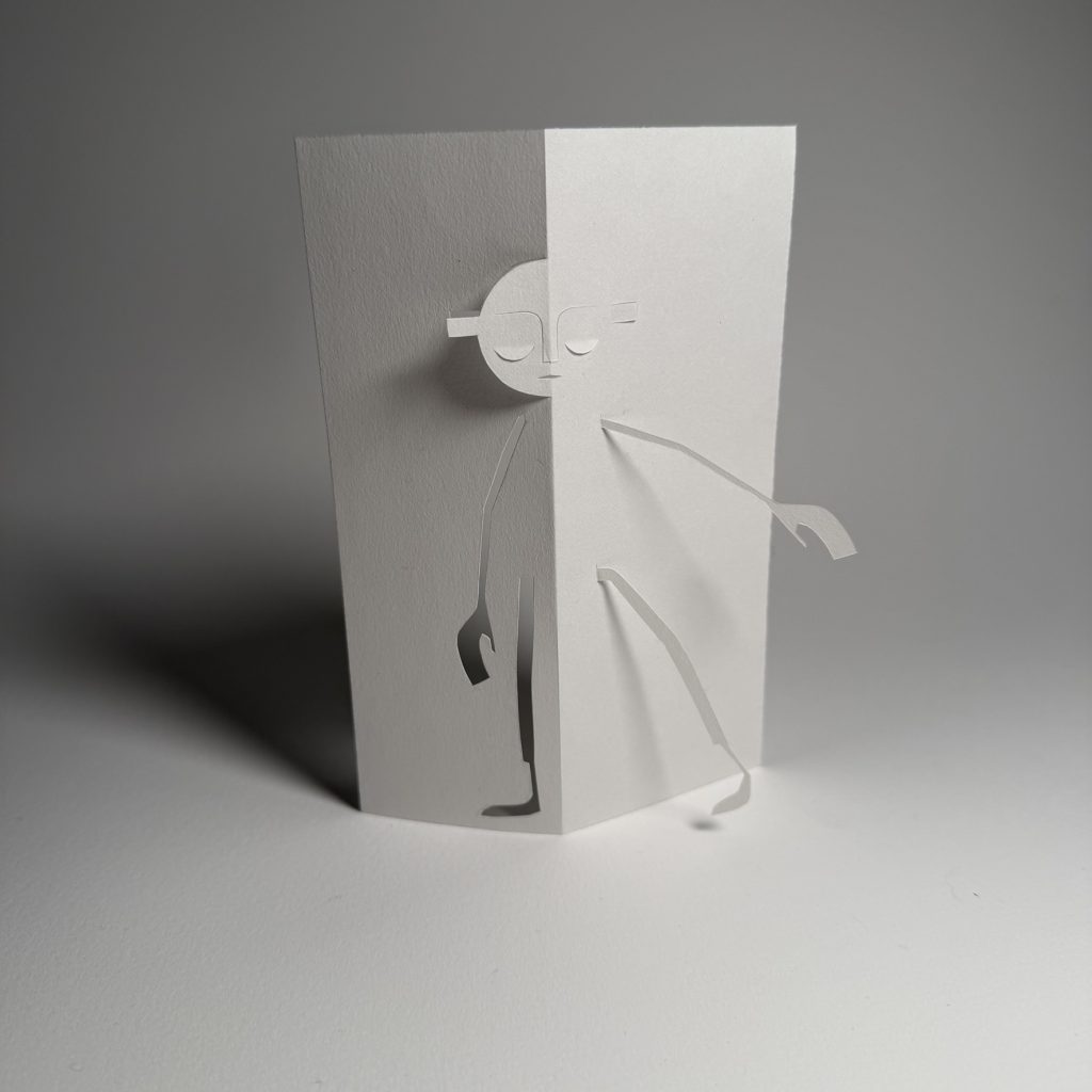 I like the half outline of the head, so that though the facial features are mirrored, only the cutout side folds out and reveals its profile. This gives multiple options for folding and viewing the face. As papercutting creates lines which are double sided – present in reverse on both sides of the paper, when pushed through and folded, the negative space of the facial outline reveals variable views and insights. Again, simple, but exciting and intriguing as to how to explore the sculptural space.