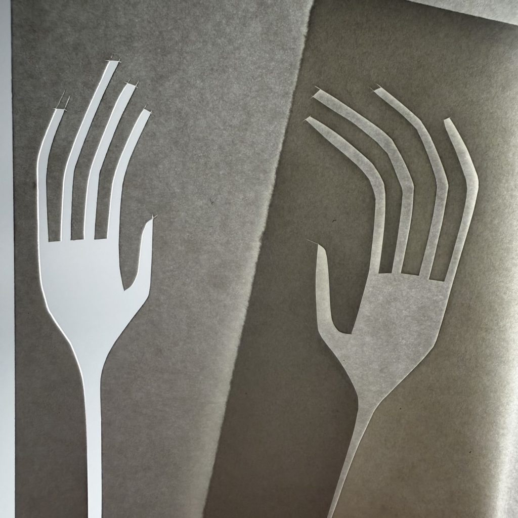 The evocative nature of shadow is an exciting aspect. The positive and negative spaces of the papercut figures are augmented by the high contrast extremes of light and shadow, sometimes softened by a merge of greyscale in-betweens.